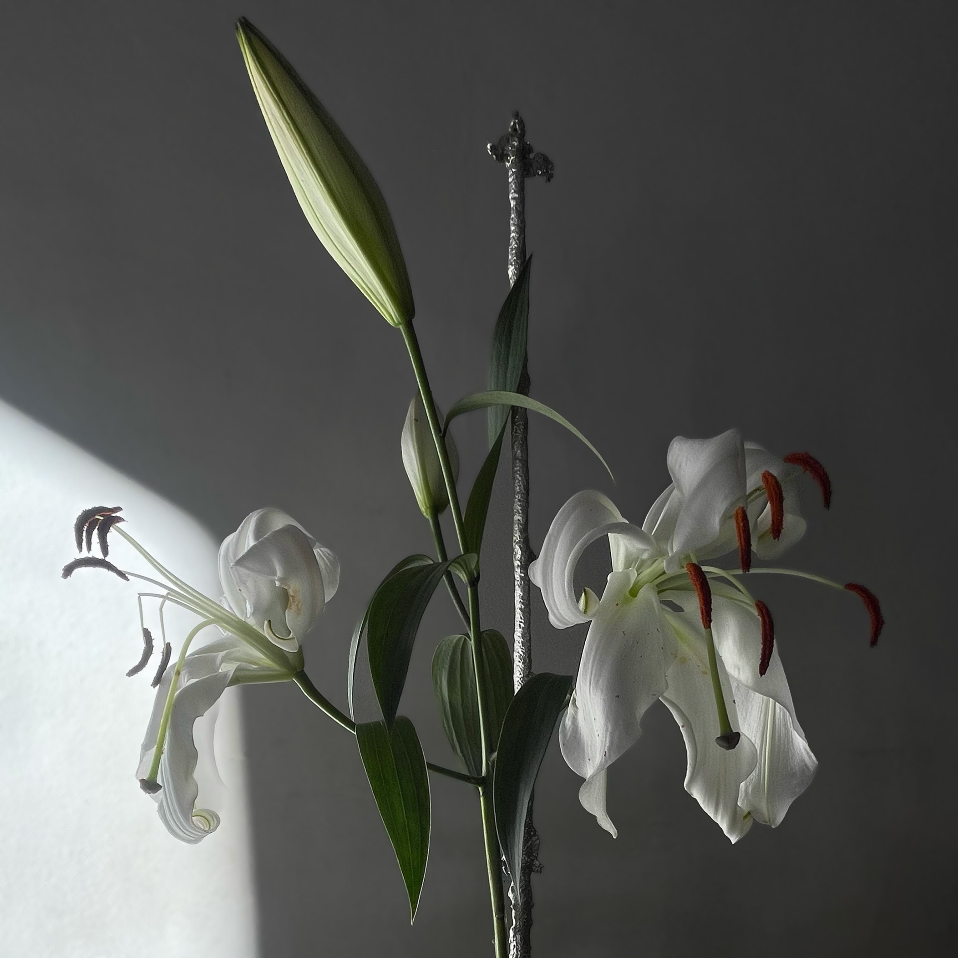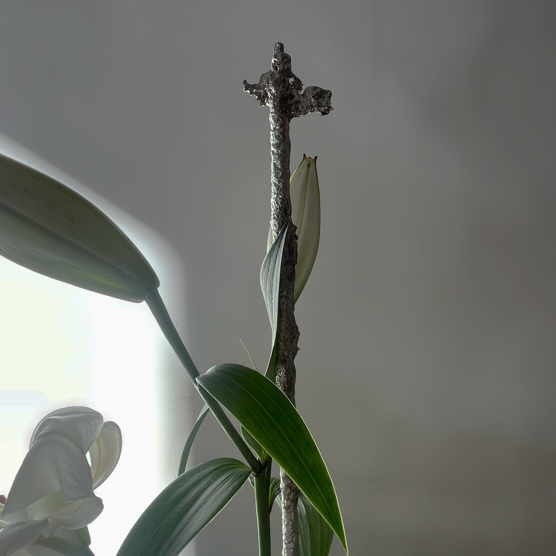 the dying flower station (1) is a single flower stand with no water. the station is made of pewter and cast using a sand mold. every piece is unique.